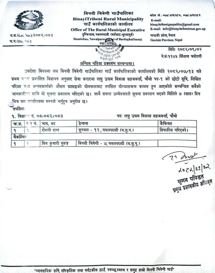 अन्तिम नतिजा प्रकशंन सम्बन्धमा।