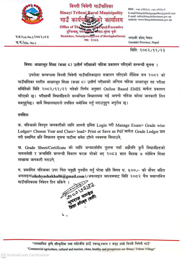 आधारभूत शिक्षा (कक्षा ८) उत्तीर्ण परीक्षाको नतिजा प्रकाशन गरिएको सम्बन्धी सूचना