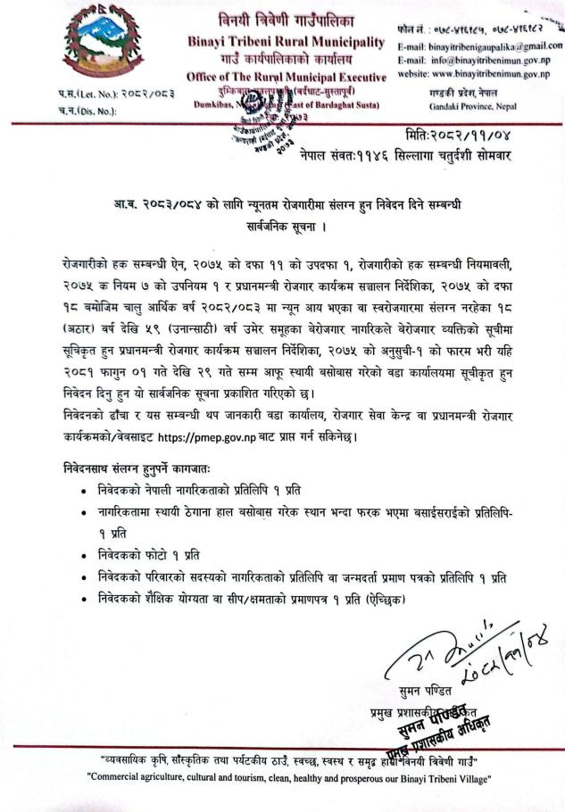 आ.व. २०८३/०८४ को लागि न्यूनतम रोजगारीमा संलग्न हुन निवेदन दिने सम्बन्धी सार्वजनिक सूचना ।