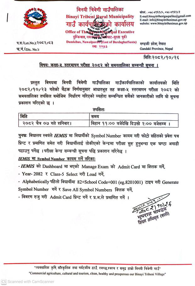 कक्षा-५ स्तरमापन परीक्षा २०८२को समुयतालिका सम्बन्धी सूचना