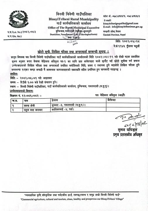छोटो सूची, लिखित परिक्षा तथा अन्तरवार्ता सम्बन्धी सूचना ।