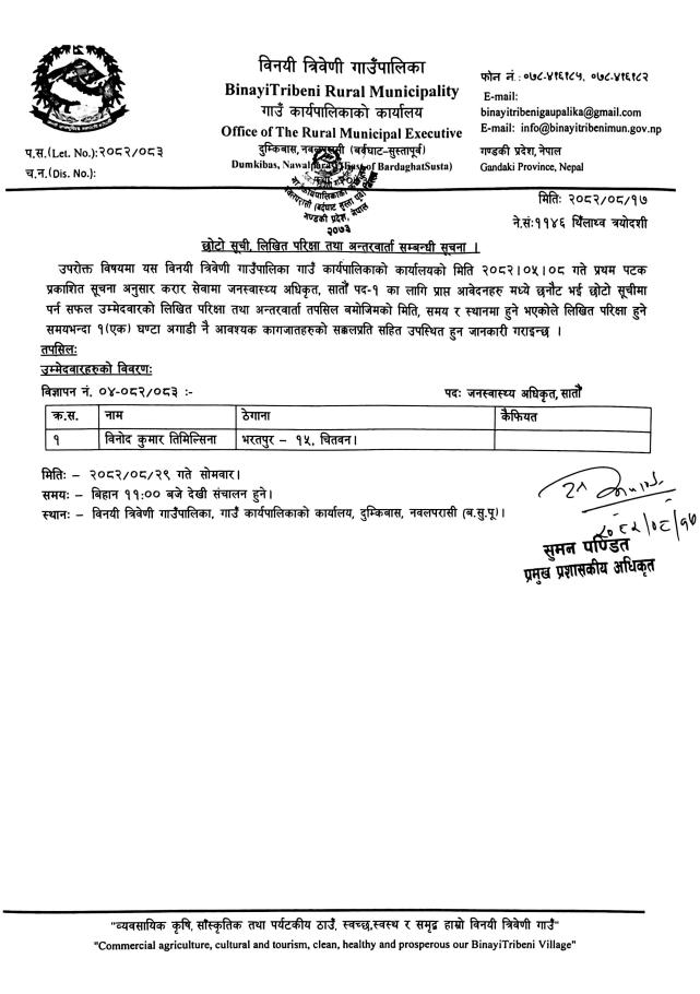 छोटो सूची, लिखित परिक्षा तथा अन्तरवार्ता सम्बन्धी सूचना ।
