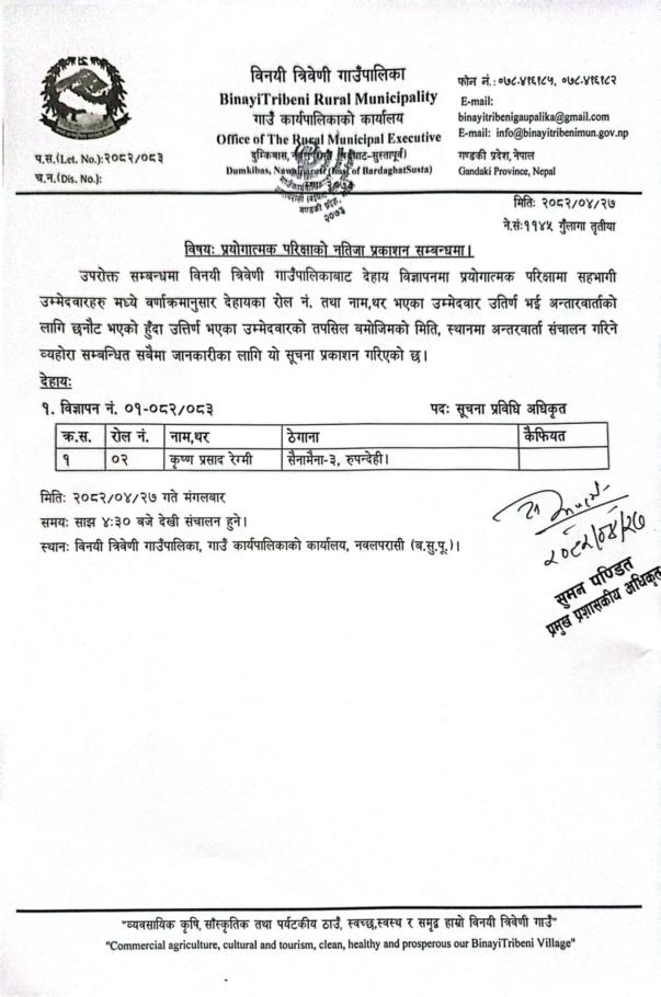 प्रयोगात्मक परिक्षाको नतिजा प्रकाशन सम्बन्धमा।