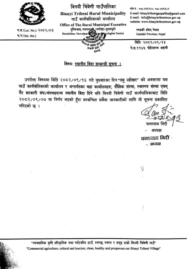 स्थानीय बिदा सम्बन्धी सूचना ।