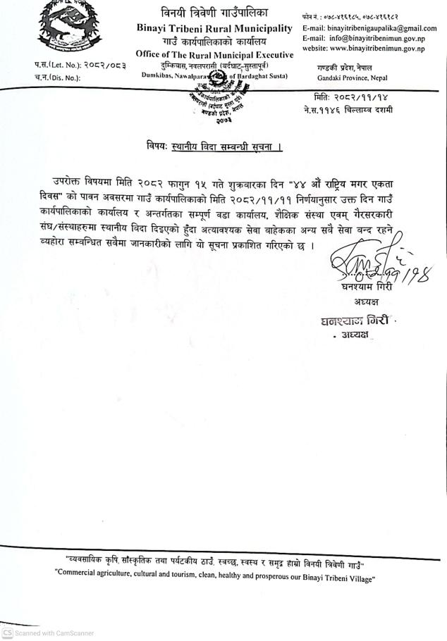 स्थानीय बिदा सम्बन्धी सूचना ।