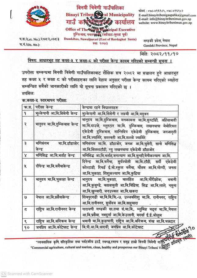 आधारभूत तह कक्षा-५ र कक्षा-८ को परीक्षा केन्द्र कायम गरिएको सम्बन्धी सूचना ।