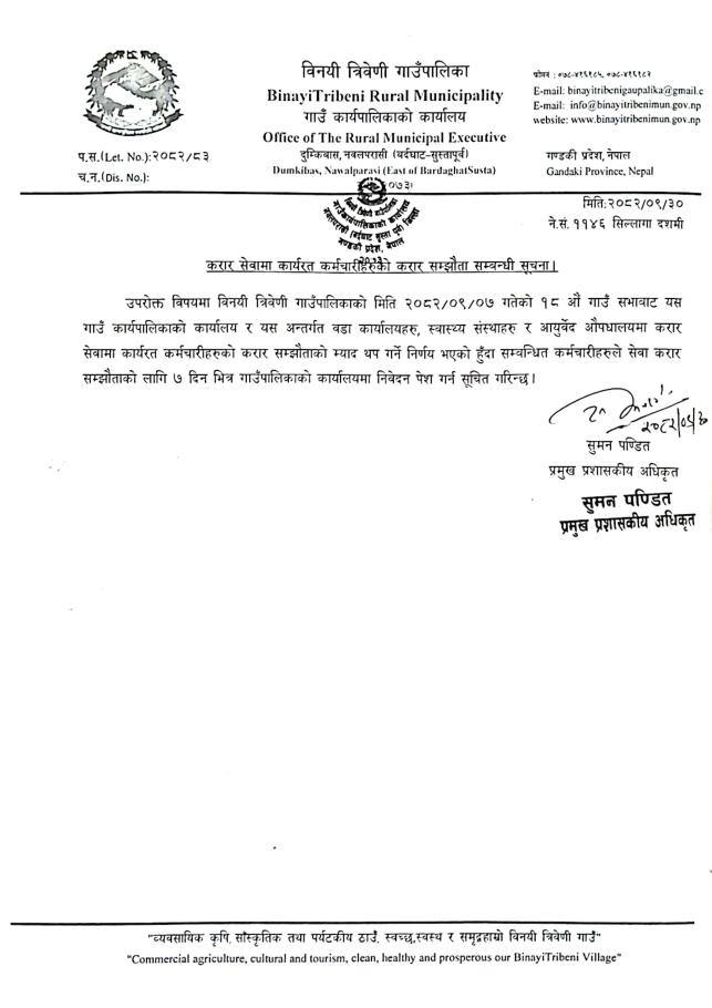 करार सेवामा कार्यरत कर्मचारीहहैंको करार सम्झौता सम्बन्धी सचना।