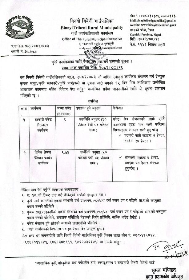कषि कार्यक्रमका लागि ईच्छा पत्र पेश गर्ने सम्बन्धी सूचना ।