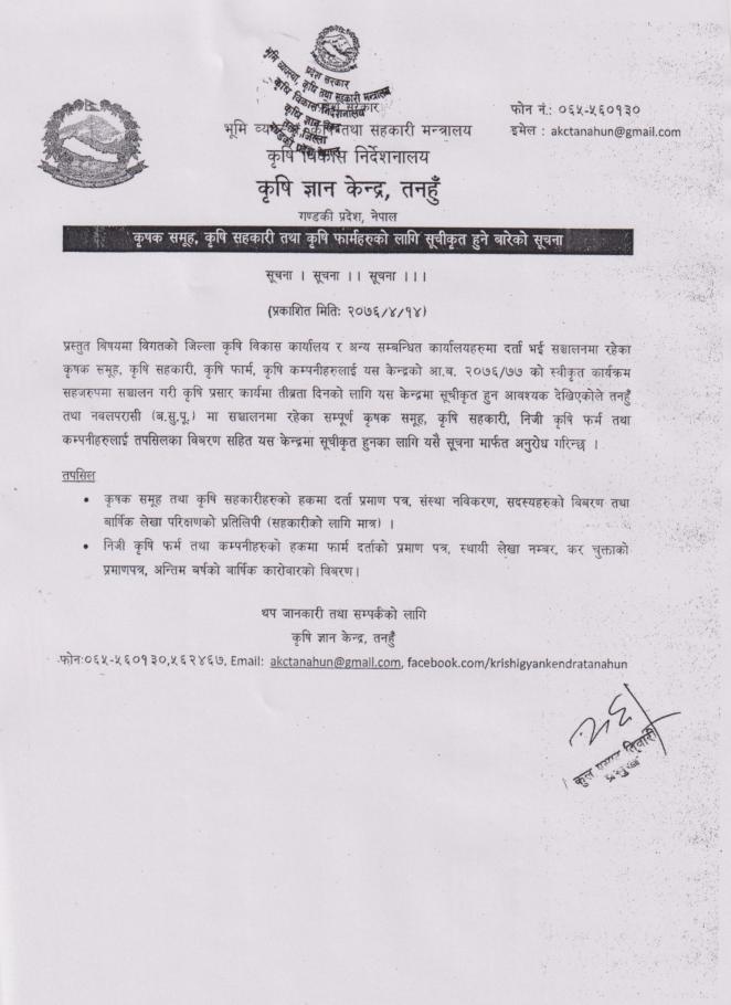 कृषक समुह ,कृषि सहकारी तथा कृषि फर्महरूको लागी सुचिकृत हुने बारेको सूचना !