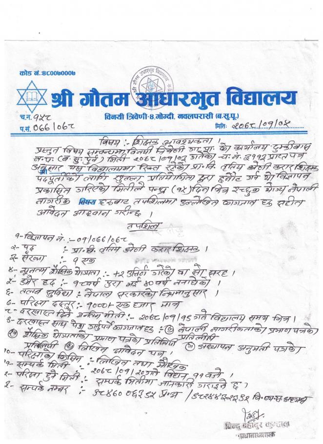 गौतम आधारभूत विद्यालयको लागी शिक्षक आवश्यकता सम्बन्धी सुचना ।