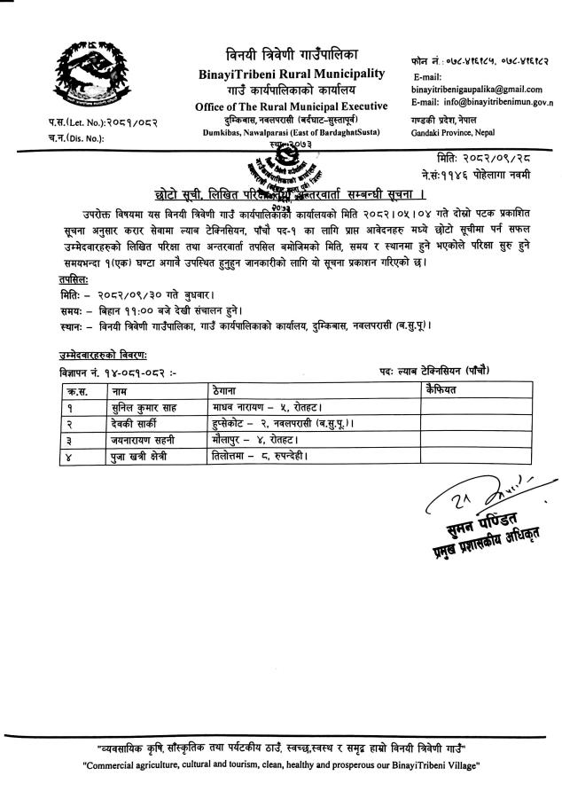 छोटो सूची, लिखित परिक्षा तथा अन्तरवार्ता सम्बन्धि सूचना