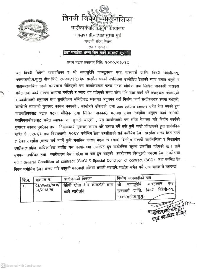 ठेक्का सम्झौता अन्त्य किन नगर्ने सम्बन्धी सूचना
