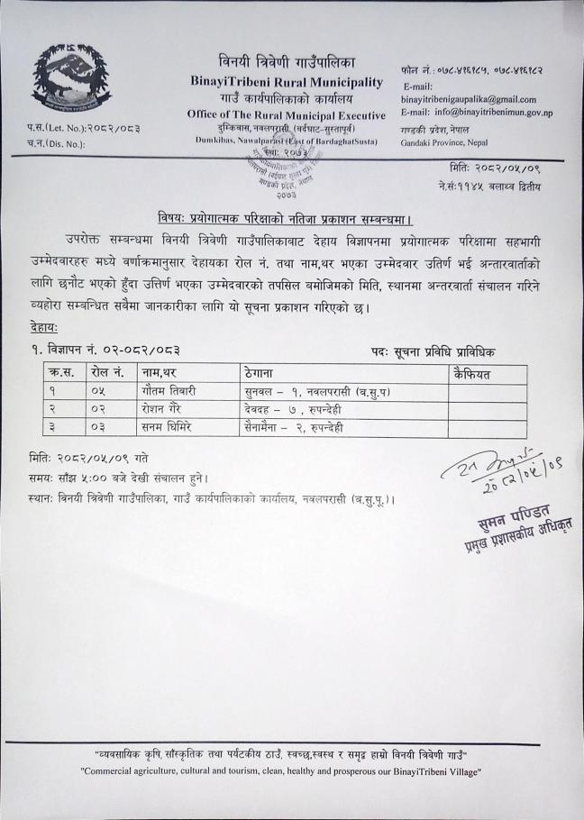 प्रयोगात्मक परिक्षाको नतिजा प्रकाशन सम्बन्धमा ।