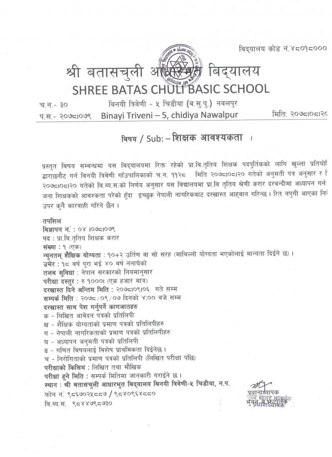 बतासचुलि आधारभूत विद्यालयको लागि शिक्षक आवश्यकता सम्बन्धि सुचना ।