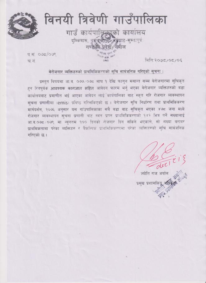 बेरोजगार व्यक्तिहरुको प्राथमिकिकरण सूचि सार्वजनिक गरिएको सम्बन्धि सुचना ।