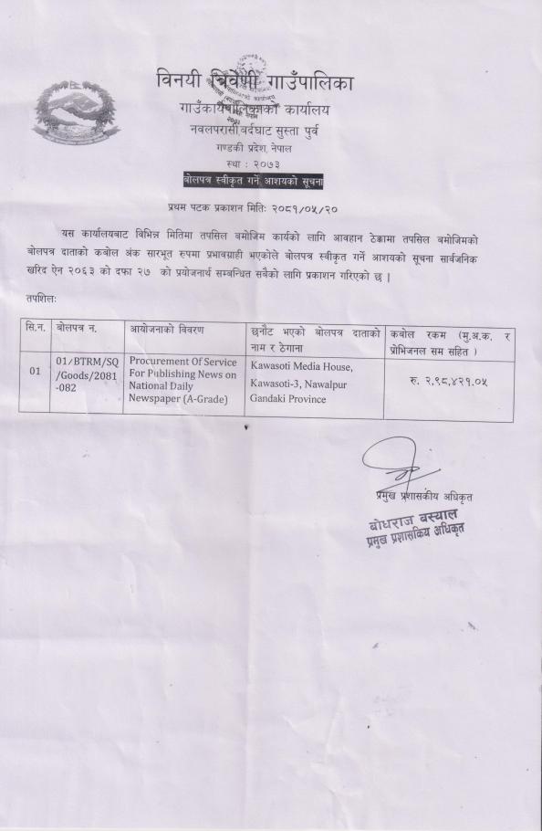 बोलपत्र स्वीकृत गर्ने आशयको सूचना ।