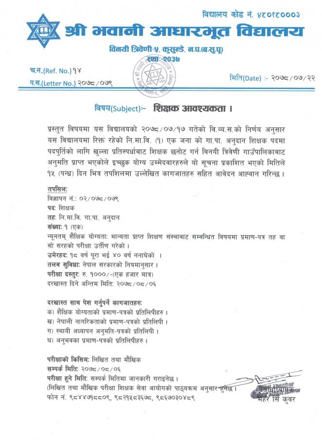 भवानी आधारभूत विद्यालयमा शिक्षक आवश्यकता सम्बन्धि सुचना ।