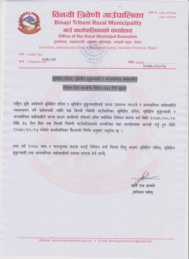 भूमिहिन दलित, भूमिहिन सुकुम्बासी र अव्यवस्थित बसोबासीले निवेदन दिने सम्बन्धि ३५ दिने सुचना ।