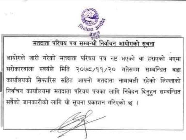 मतदाता परिचयपत्र सम्बन्धी निर्वाचन आयोगको सूचना ।