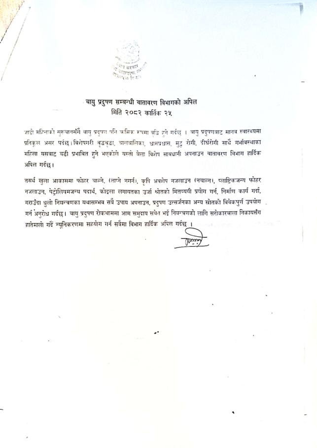 वायु प्रदुषण सम्बन्धी वातावरण विभागको अपिल