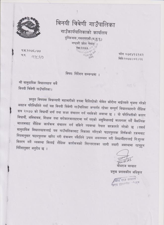 विनयी त्रिवेणी गाउँपालिका अन्तर्गतका सामुदायिक विद्यालयहरुका लागी निर्देशन सम्बन्धमा ।