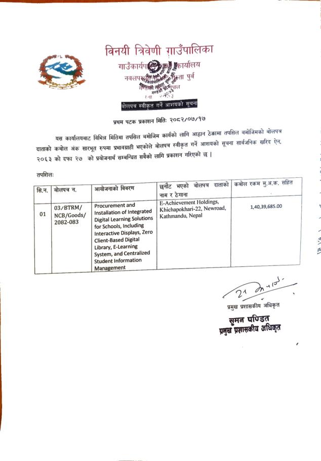वोलपत्र स्वीकृत गर्ने आशयको सूचना