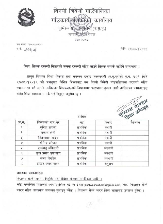 शिक्षक दरबन्दि मिलानको क्रममा दरबन्दी सहित आउने शिक्षक सम्पर्क भइदिने सम्बन्धमा ।