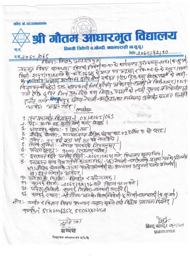 श्री गौतम आधारभुत विद्यालयको लागि शिक्षक आवश्यकता सम्बन्धि सुचना ।