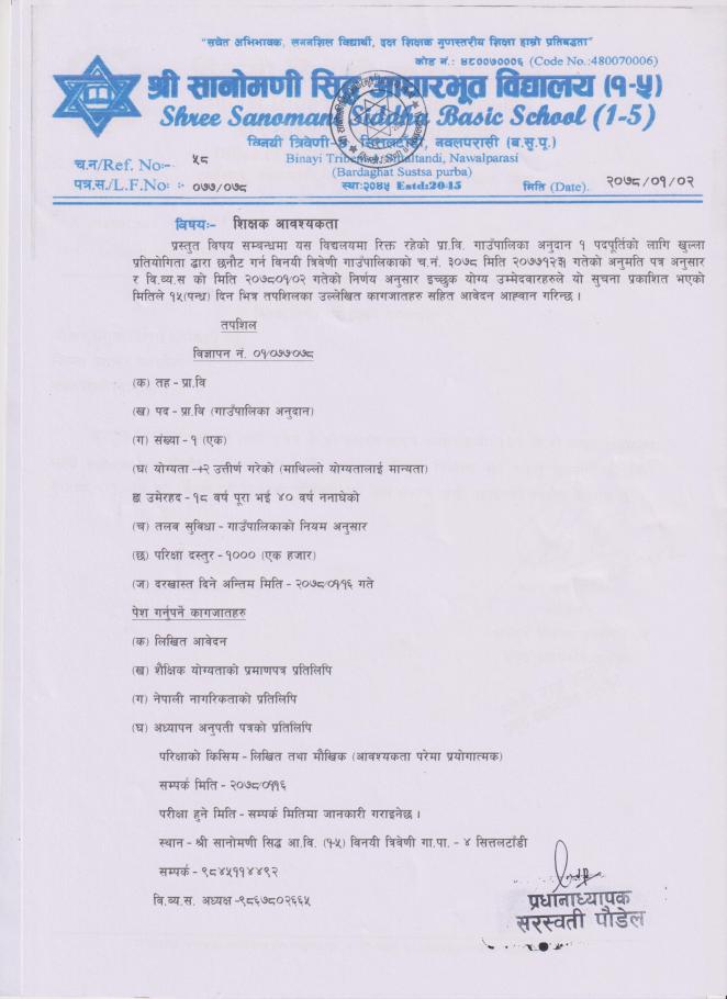 श्री सानोमणी सिद्ध आधारभूत विद्यालयको लागी शिक्षक आवश्यकता सम्बन्धी सुचना !