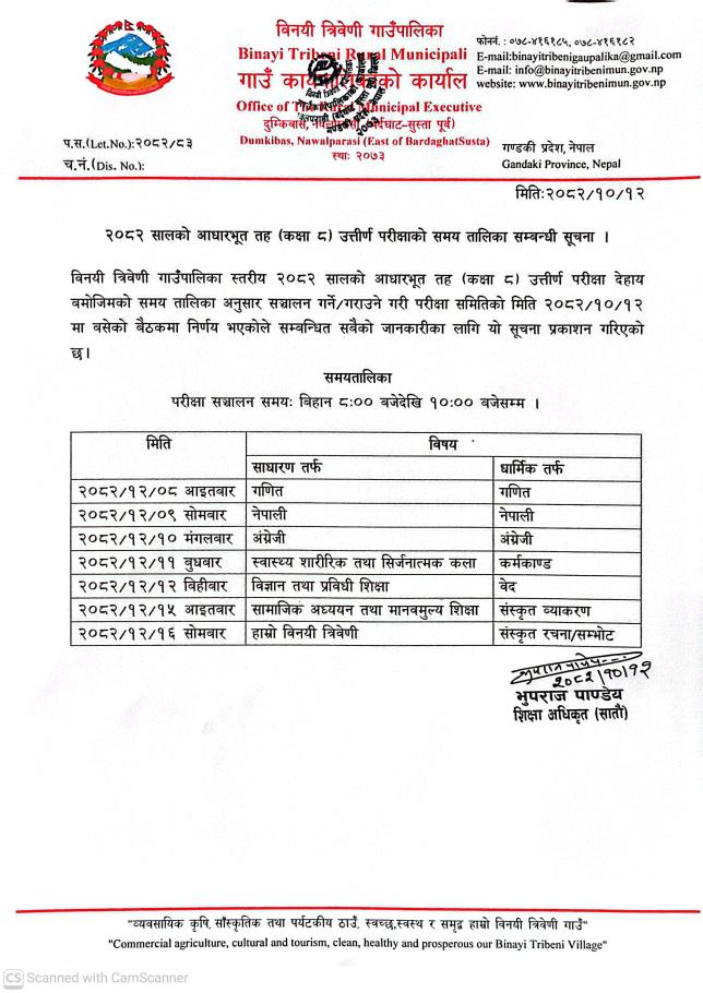 २०८२ सालको आधारभूत तह (कक्षा ८) उत्तीर्ण परीक्षाको समय तालिका सम्बन्धी सूचना ।