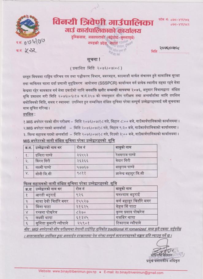 MIS अपरेटर तथा फिल्ड सहायक पदकाे सिप परिक्षण तथा अन्तरवार्ता संचालन सम्बिन्ध सुचना !