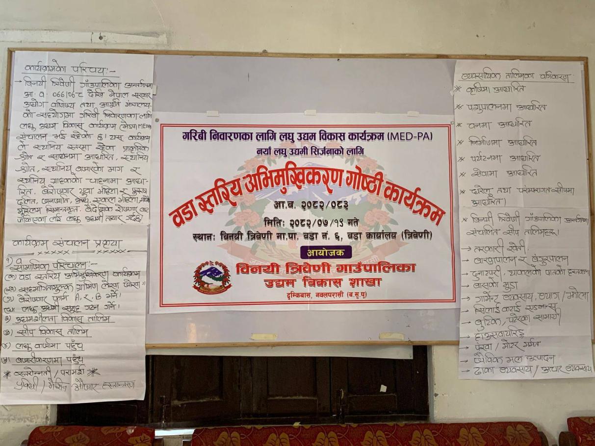 आज मिति २०८२/०७/१९ गतेका दिन विनयी त्रिवेणी गा .पा.वडा नं .६ को कार्यालयमा गरिबी निवारणका लागि लघु उद्यम विकास कार्यक्रम(मेडपा) आ.व.०८२/०८३ अन्तर्गत नयॅा लघु सृजना गर्न १ दिने वडा स्तरिय अभिमुखिकरण गोष्ठी कार्यक्रम वडा अध्यक्ष श्री नुरेन्द्र शाहको अध्यक्षतामा वडा सदस्य लगायत स्थानिय समाजसेवी संघ संस्थाका प्रतिनिधि ज्यू हरूको सकृय सहभागिताको साथमा समपन्न गरियो ।