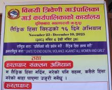 'प्रविधिको सहि प्रयोग गरौँ, लैङ्गकि हिंसाको अन्त्य गरौँ।' भन्ने नारालाई आत्मसात् गर्दै विनयी त्रिवेणी गाउँपालिकाको आयोजनामा 'लैङ्गिक हिंसा विरुद्धको १६ दिने अभियान' को पहिलो दिन हस्ताक्षर ,दुम्किवास क्षेत्रमा र्याली गर्दै कोटसभा गरि कार्यक्रम सम्पन्न भएक